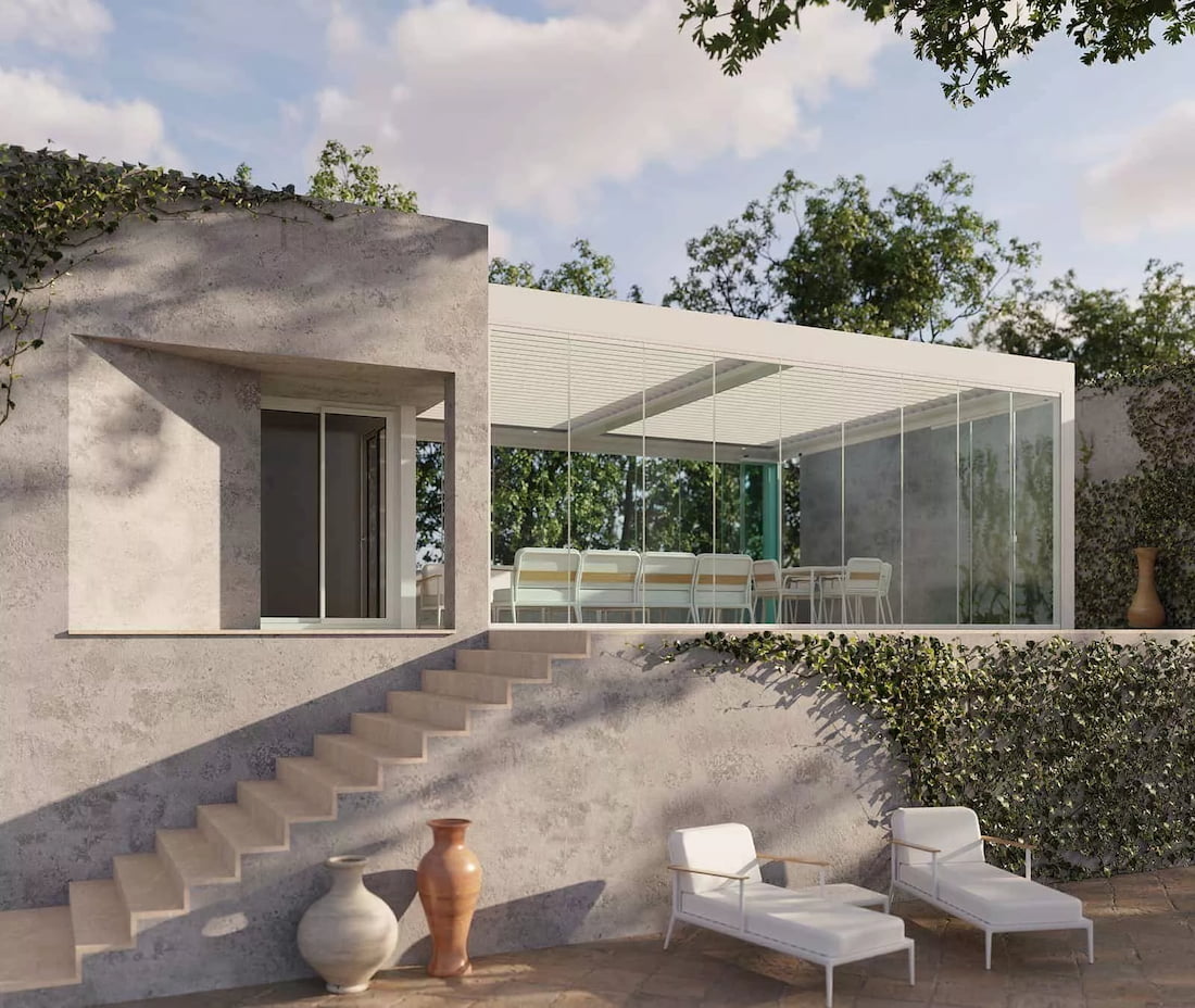 Aunque tradicionalmente se asocian con el verano, las pérgolas bioclimáticas bien equipadas son una excelente opción de cerramientos para exteriores para los meses más fríos. El sistema de lamas orientables permite regular la cantidad de luz y ventilación, adaptando el espacio a las condiciones del clima durante todo el año.