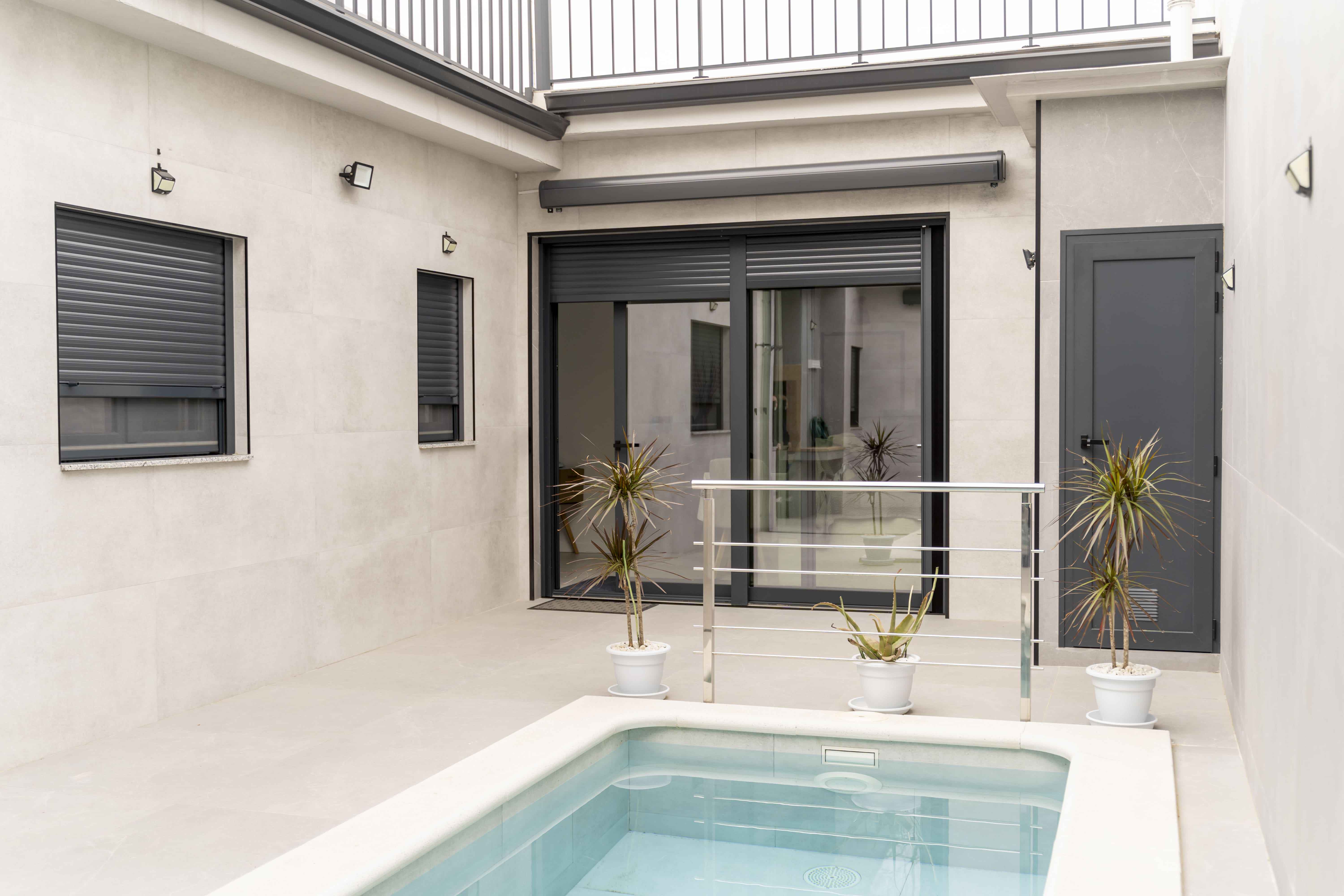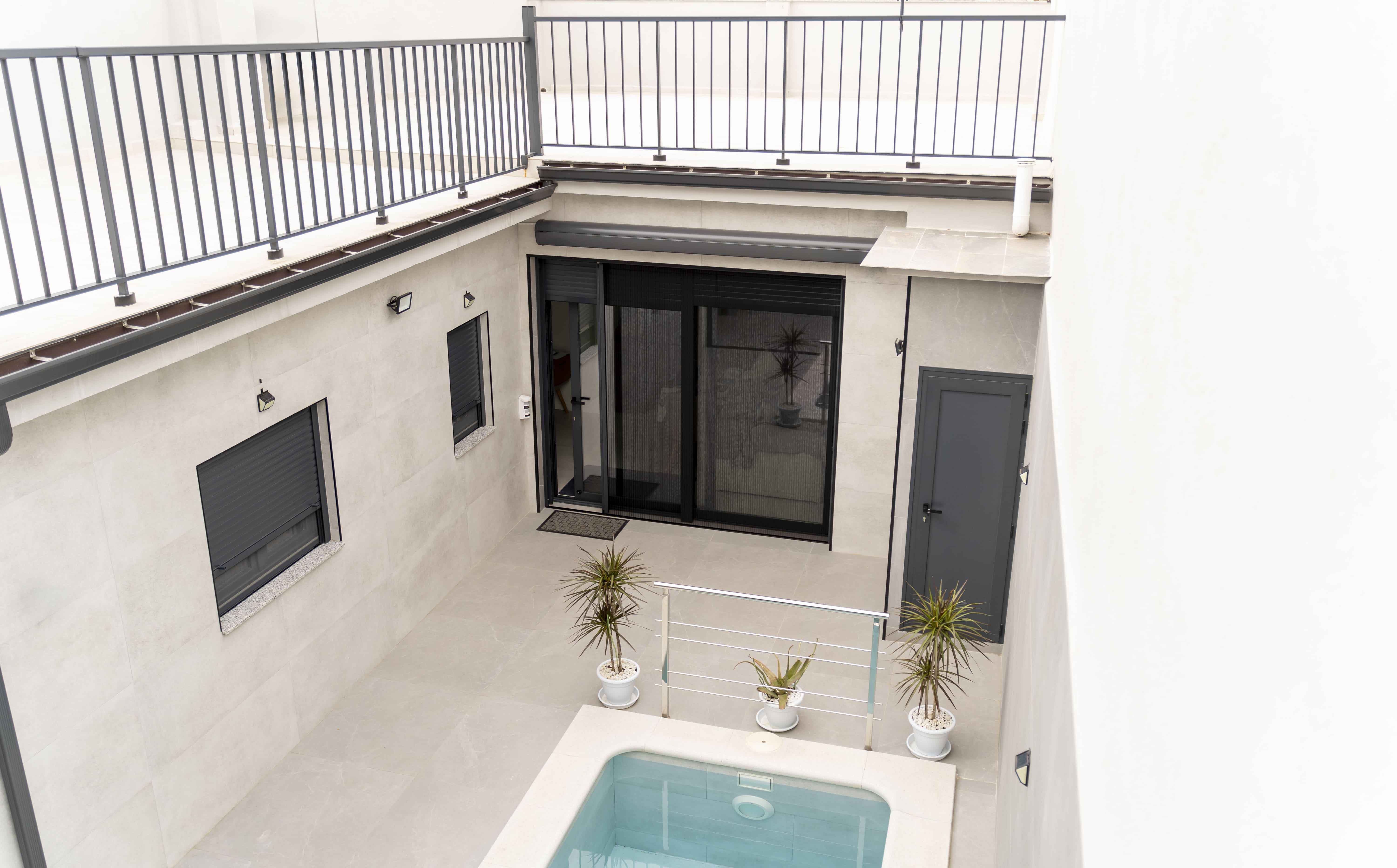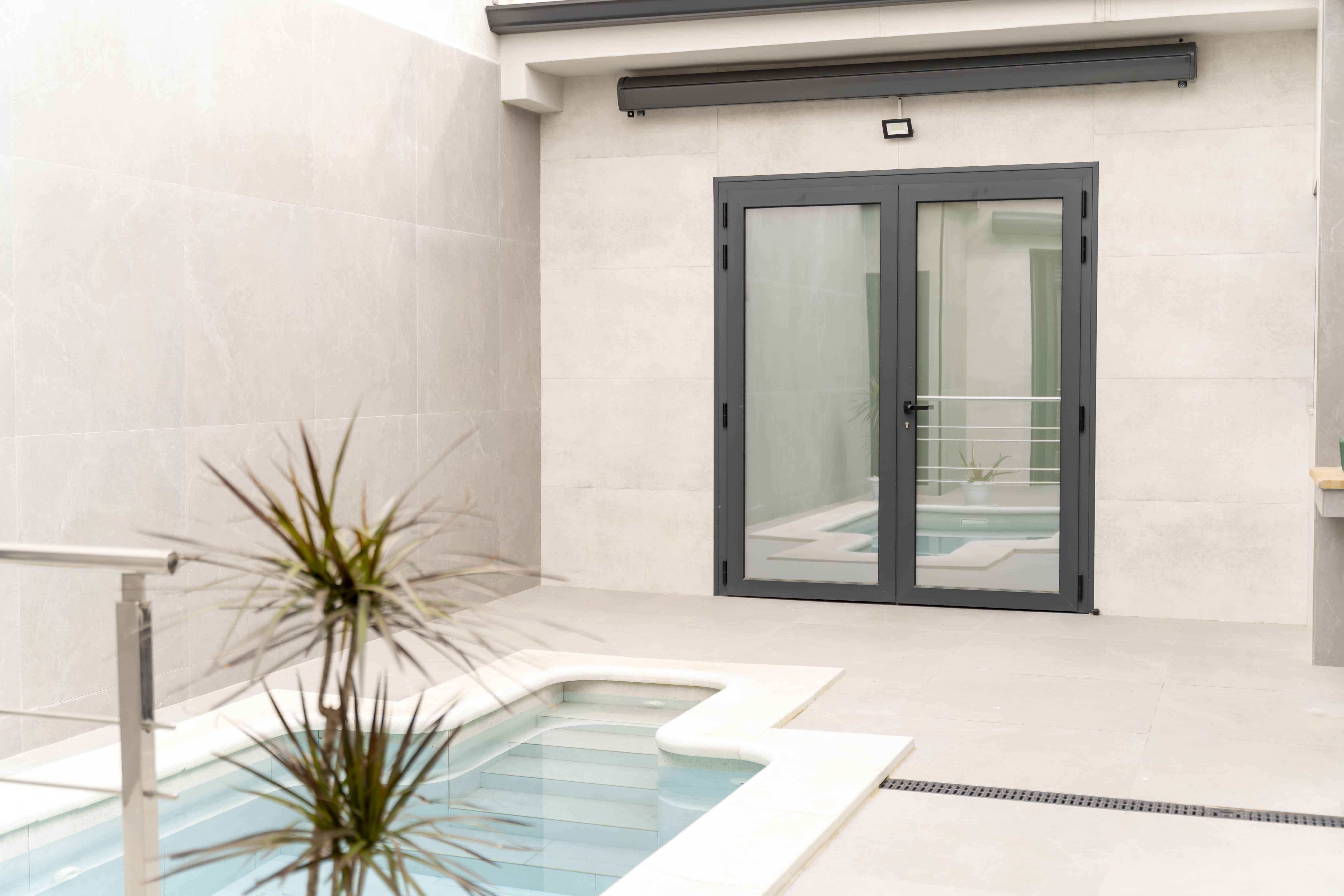 Reforma integral de casa tradicional de pueblo mejorando el diseño y la eficiencia energética con ventanas abatibles de nuetra serie Luna hoja vista y ventanas correderas de nuestra serie Excellent Thermic. El tradicional corral típico de estas casa se ha reformado para tener una piscina acompañada de toldos extensibles motorizados que abarcan grandes dimensiones para lograr una temperatura regulable y óptima.