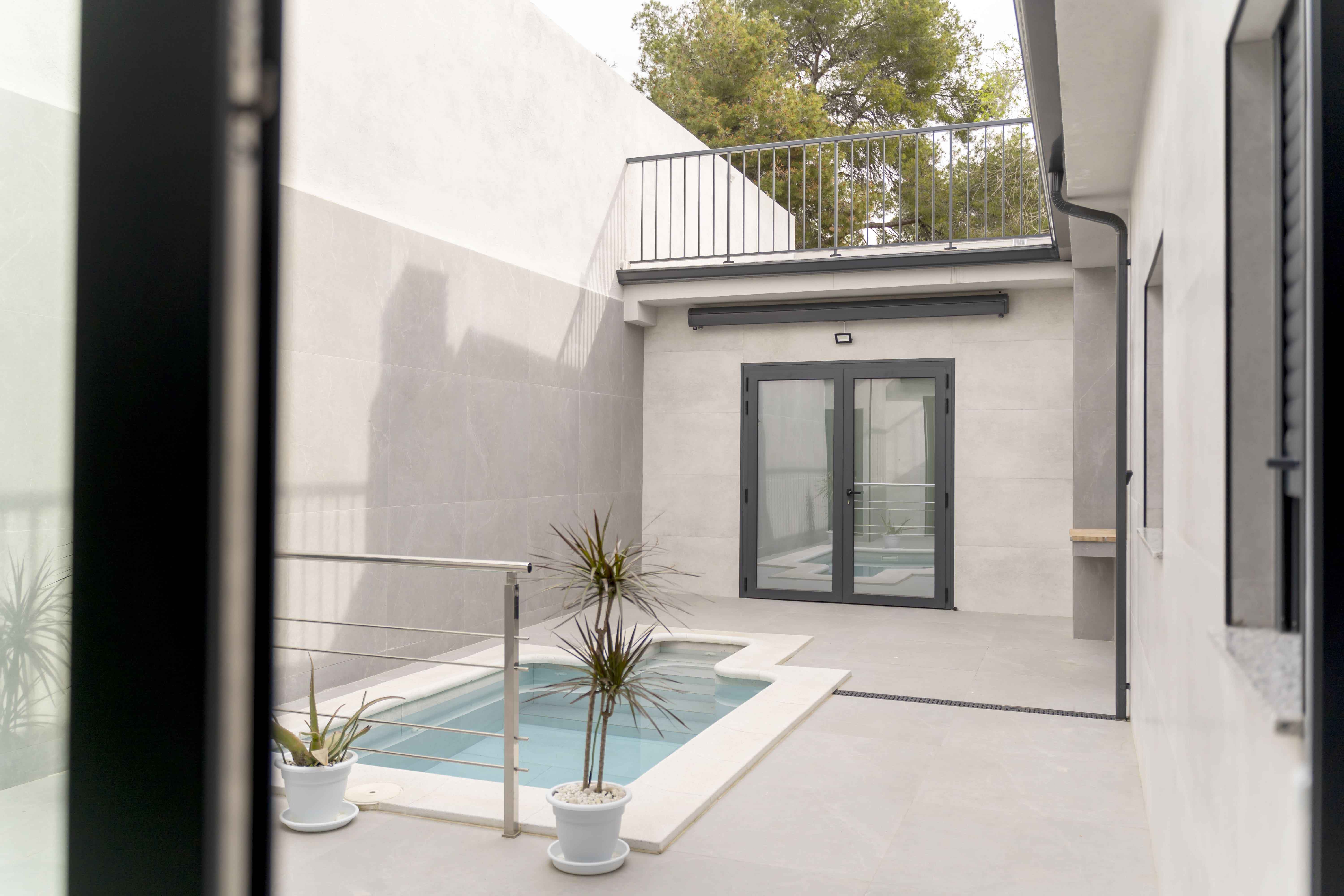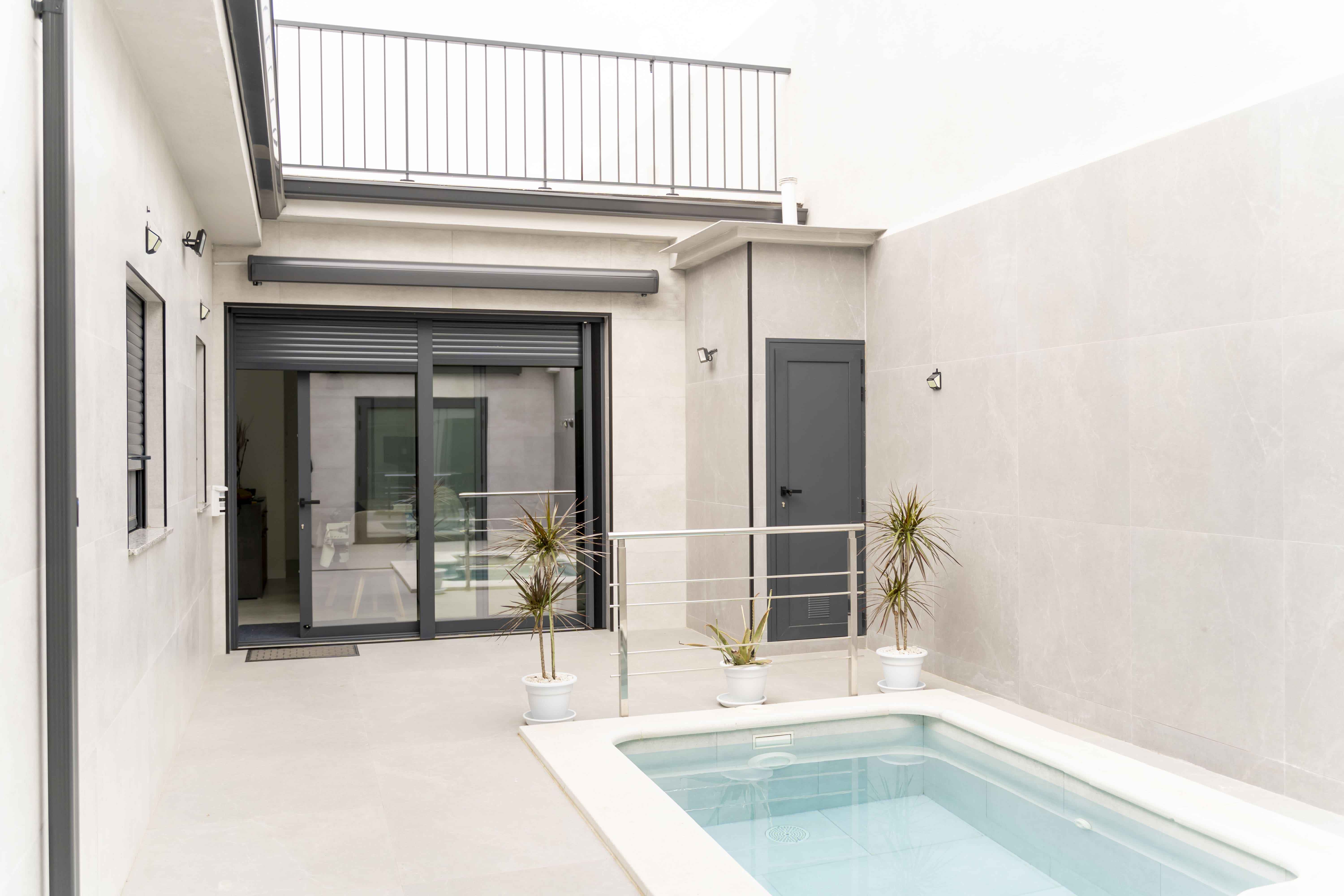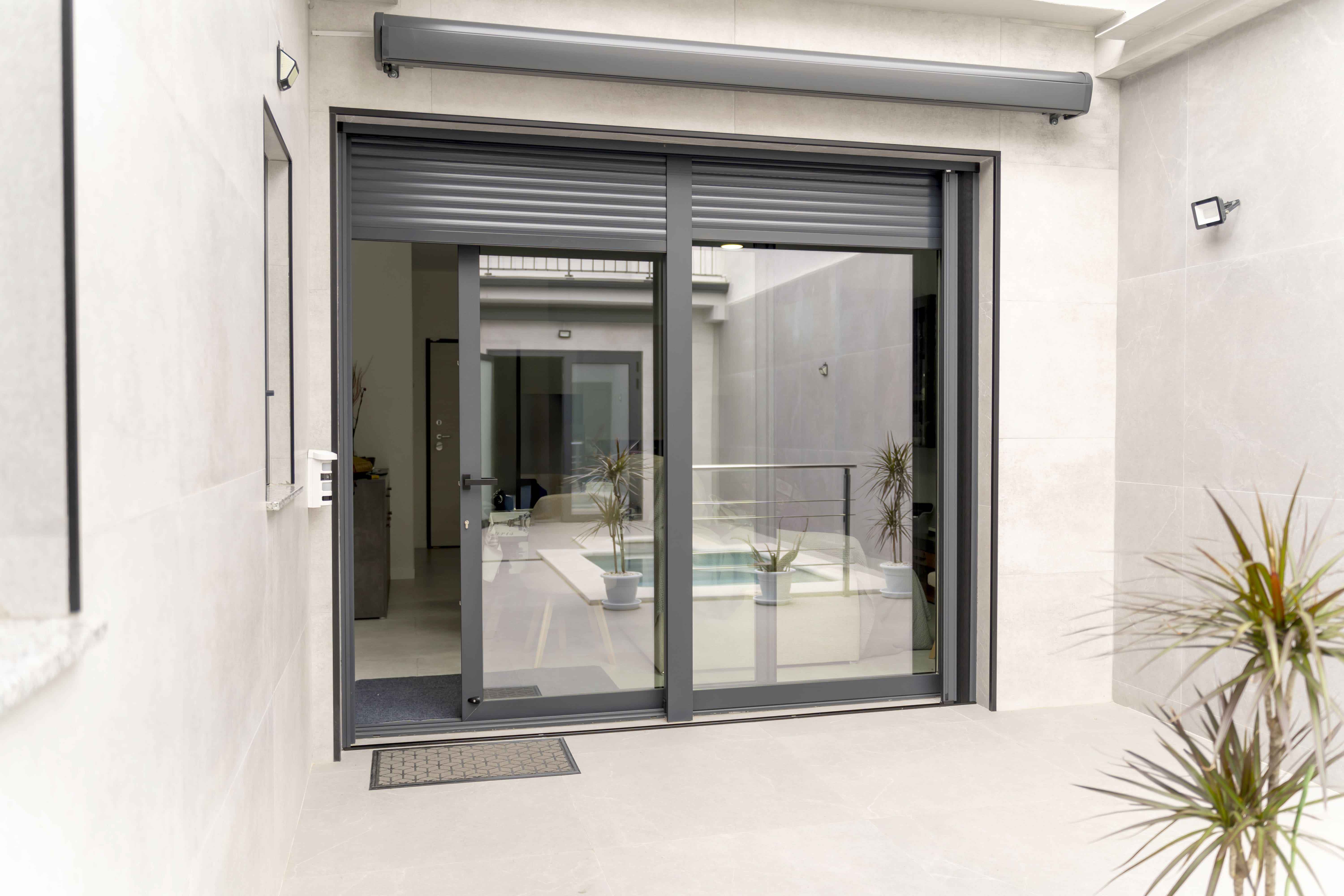 Reforma integral de casa tradicional de pueblo mejorando el diseño y la eficiencia energética con ventanas abatibles de nuetra serie Luna hoja vista y ventanas correderas de nuestra serie Excellent Thermic. El tradicional corral típico de estas casa se ha reformado para tener una piscina acompañada de toldos extensibles motorizados que abarcan grandes dimensiones para lograr una temperatura regulable y óptima.