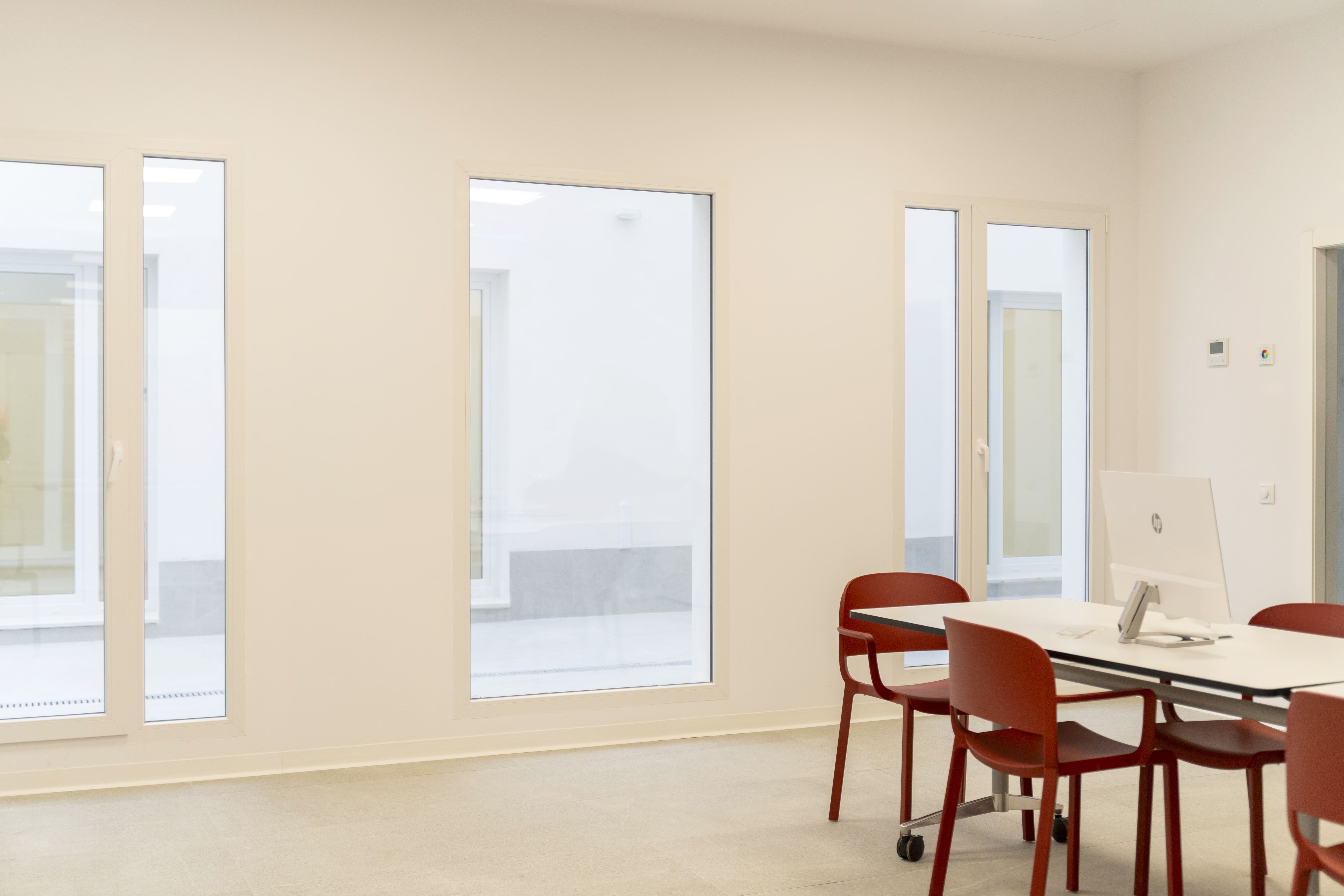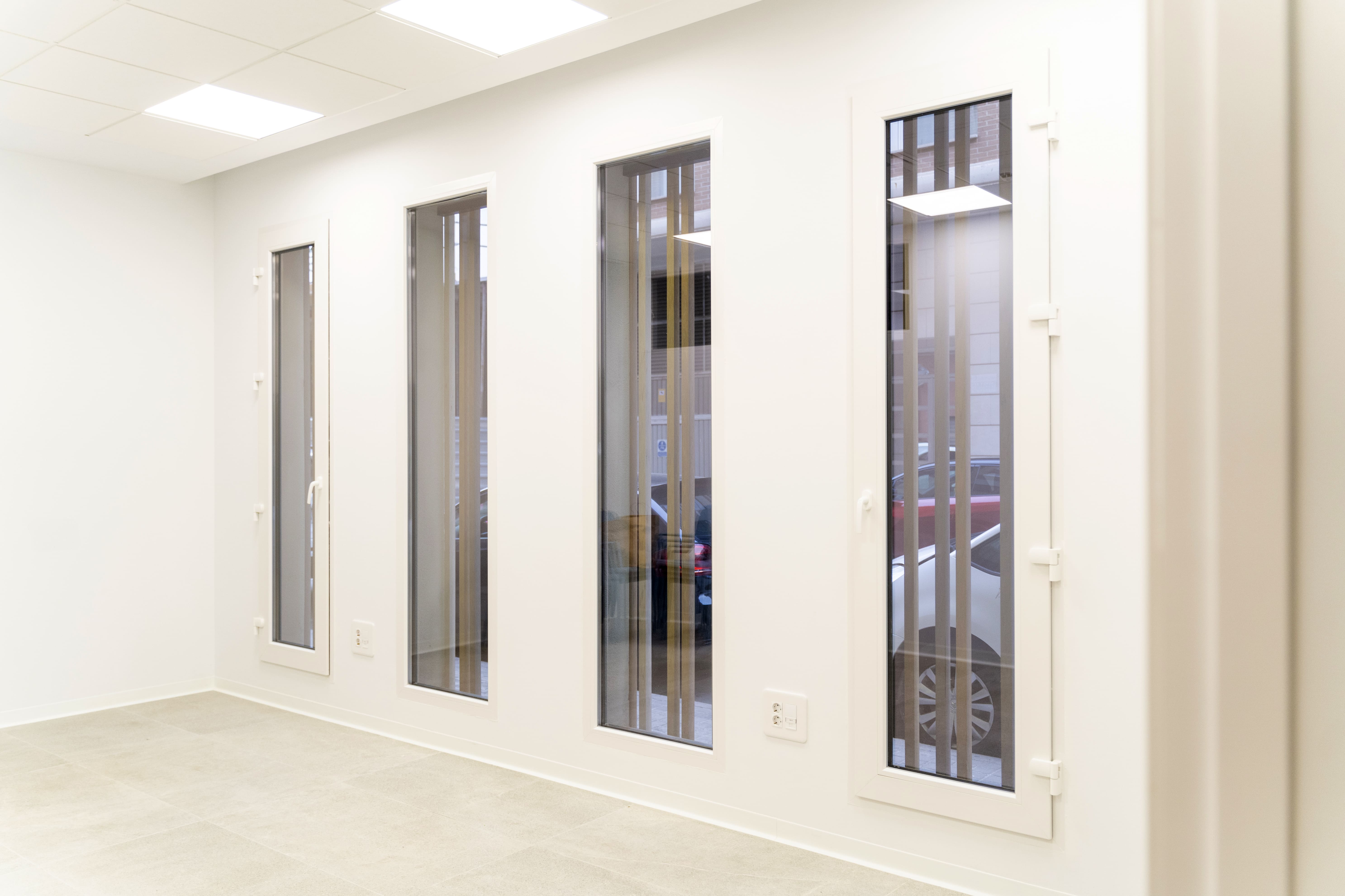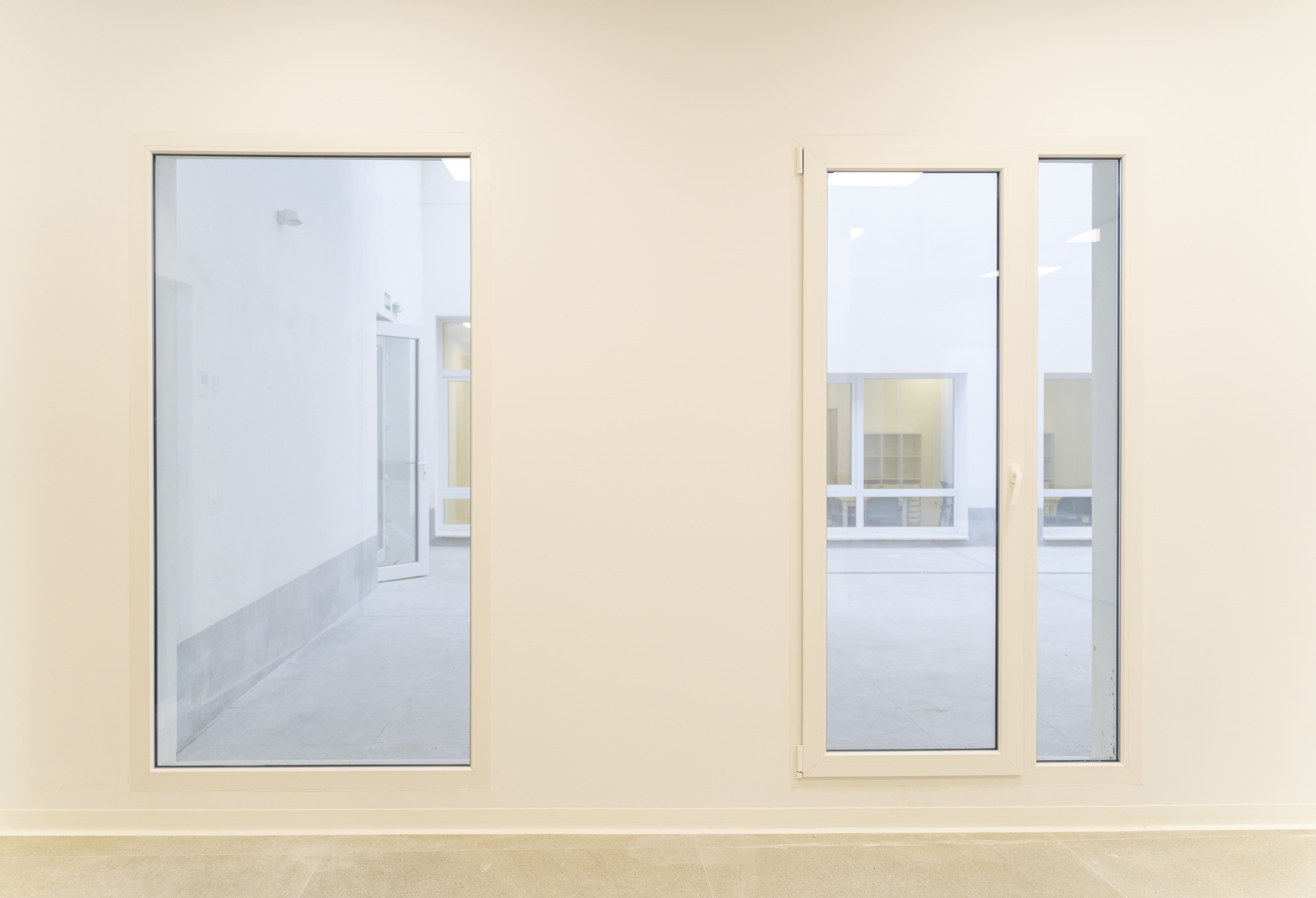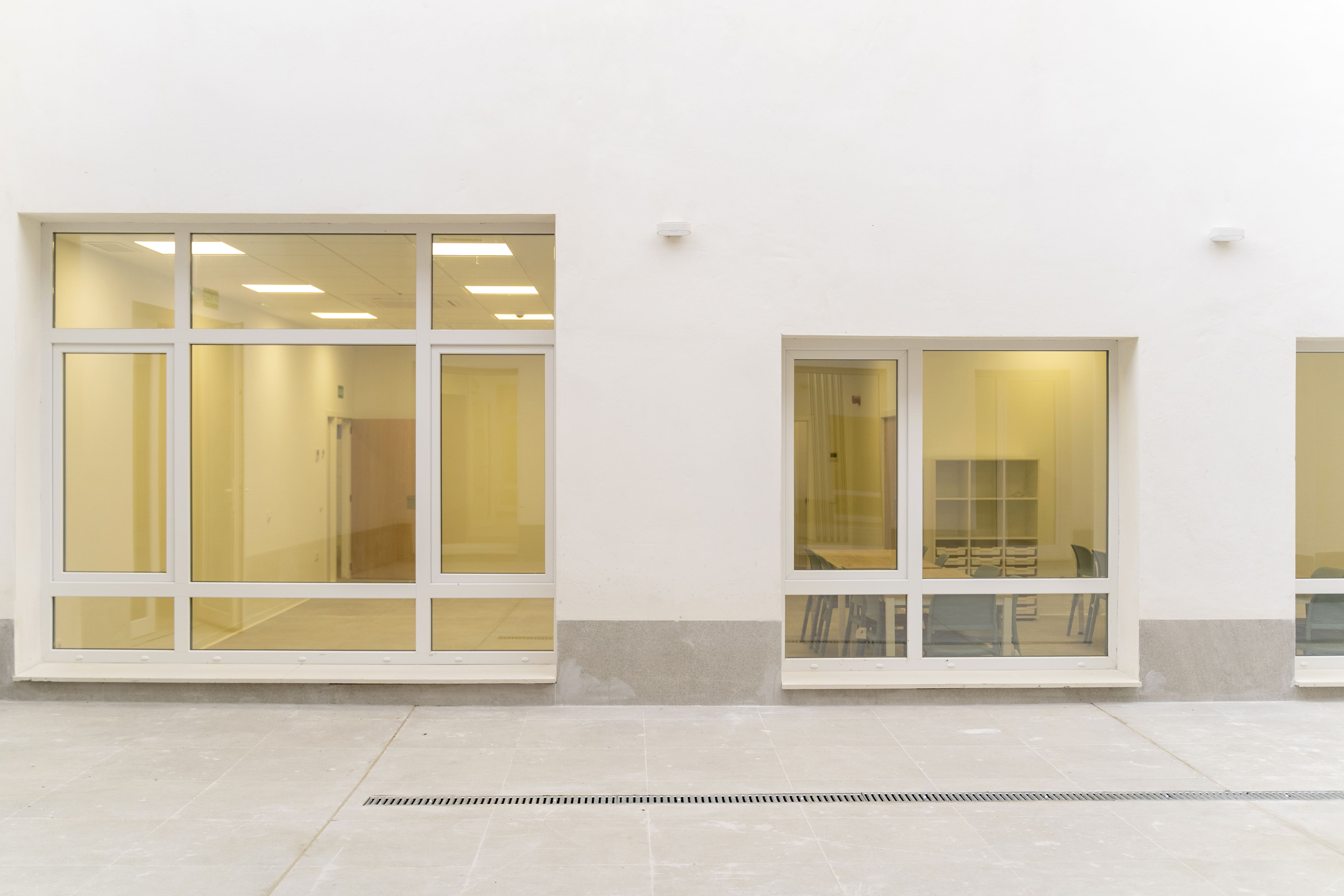 Proyecto con la Serie Common PVC 76, instalando ventanas abatibles, fijos y puertas de acceso a patios interiores en blanco mate, cuidando el confort térmico y acústico de las aulas. La puerta principal de acceso cuenta con salida de emergencia y fijos de fachada en acabado bicolor (7016 TXT exterior y blanco mate interior), aportando funcionalidad sin perder la estética. Formar parte de iniciativas como esta reafirma nuestro compromiso con la construcción de espacios que suman valor social.